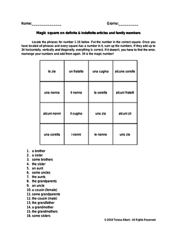 Italian Definite And Indefinite Articles Family Members Fun No Prep Worksheet Teaching Resources